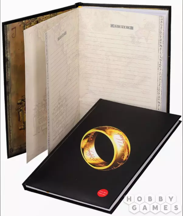 Записная книжка размером 29x19 см. с изображением Кольца Всевластия на обложке. При нажатии на правый нижний угол блокнота кольцо начинает светиться. Элементы питания в комплекте.