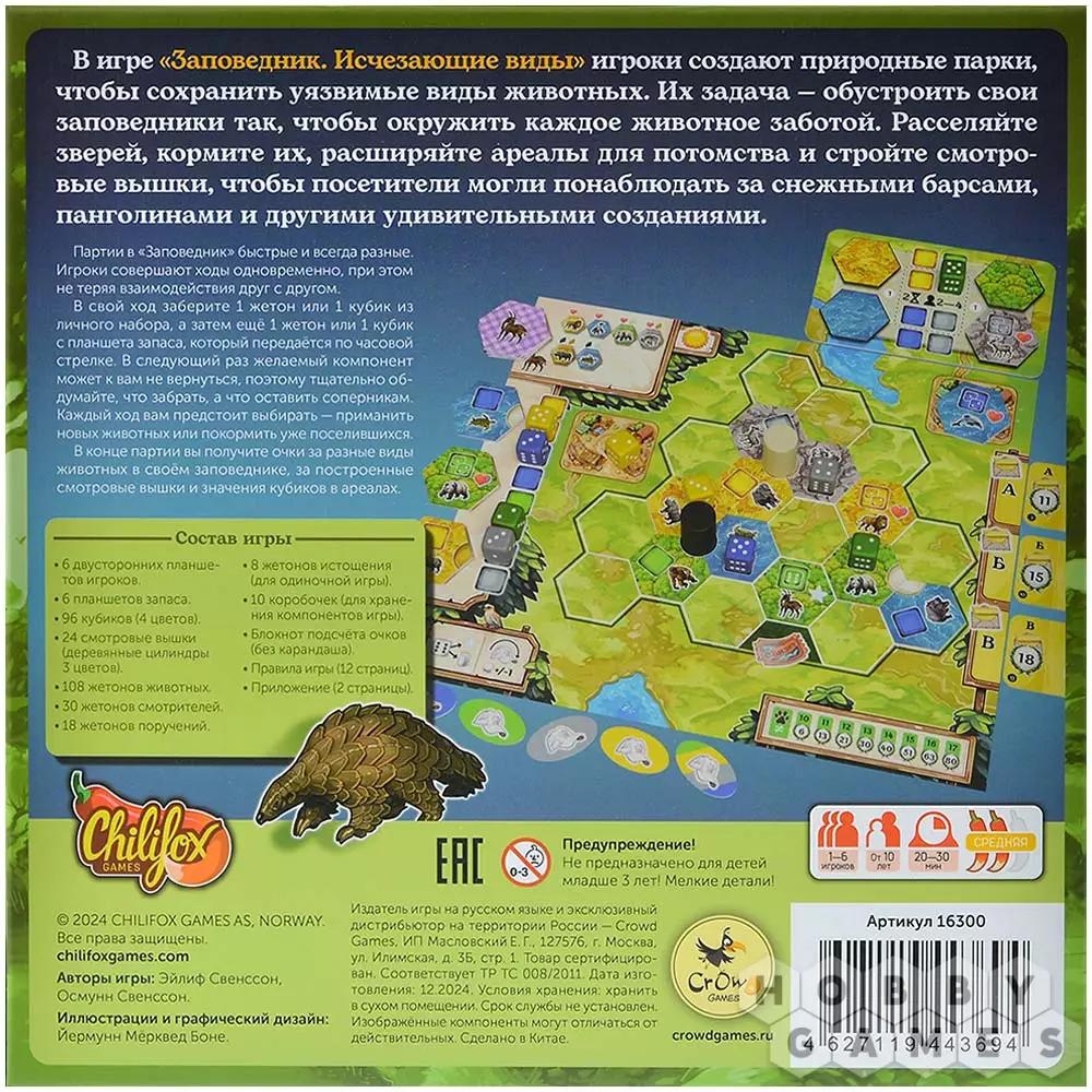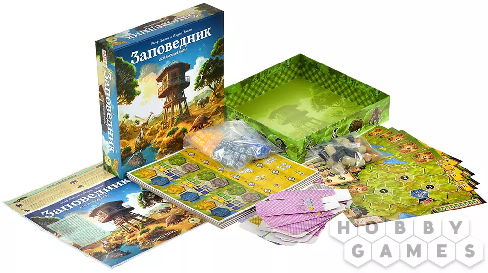 "Заповедник. Исчезающие виды" – это увлекательная стратегия, где вы строите природный парк для редких животных. Каждый ход нужно собирать фишки с животными и кубики-ресурсы, а затем грамотно расставлять их на своём поле. Чем лучше вы спланируете вольеры и и обустроите ареалы, тем больше очков получите. Особый интерес добавляет тот факт, что все игроки ходят одновременно, – а это значит, что ваши действия непосредственно влияют на то, какие ресурсы останутся соперникам. В конце игры победит тот, чей заповедник окажется самым продуманным и разнообразным! Милые иллюстрации животных и интересные тактические задачки делают эту игру отличным выбором для семейного вечера, а продуманная механика добавляет ей глубины и потому понравится ещё и любителям стратегий!