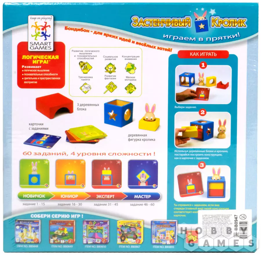 Подробная инструкция содержит полезные советы для родителей по обучению юных игроков. В настольную игру Застенчивый Кролик можно играть одному, с другом, родителями, бабушкой или дедушкой, благодаря качественному дизайну и разнообразным заданиям игра долго не наскучит малышу.
