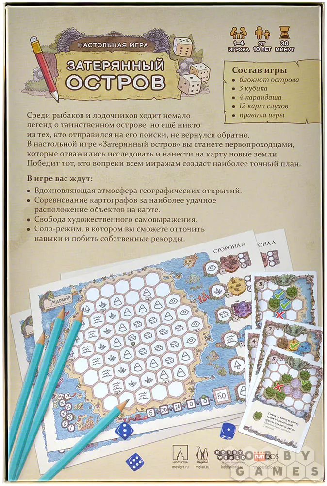Для начала нужно вооружиться карандашами и листами острова. Стоит помнить, что листы двухсторонние – но сторона Б отличается от стороны А повышенной сложностью, так что подойдёт опытным игрокам. Следом нужно выложить четыре карты слухов, содержащих задания – и можно начинать!