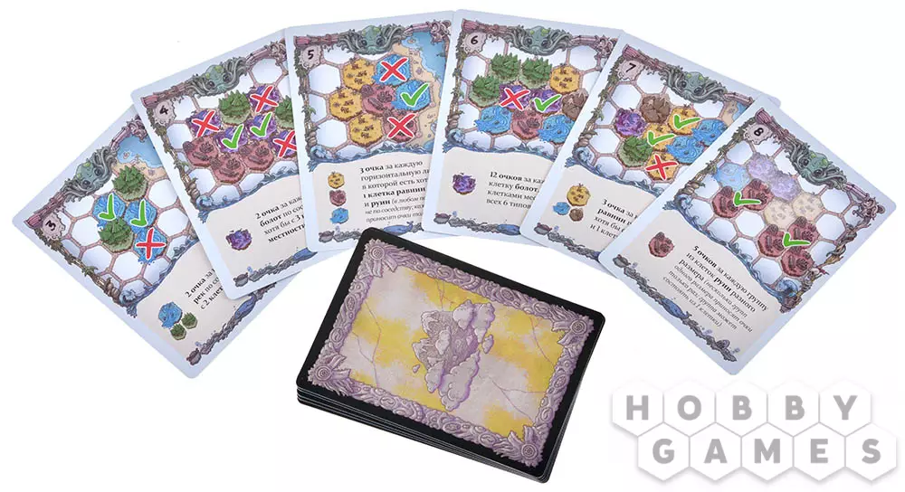 Активный игрок решает, какой тип местности будет рисовать. Здесь нужно обратить внимание на задания с карт слухов – они могут давать очки, например, за комбинации разных типов местности.