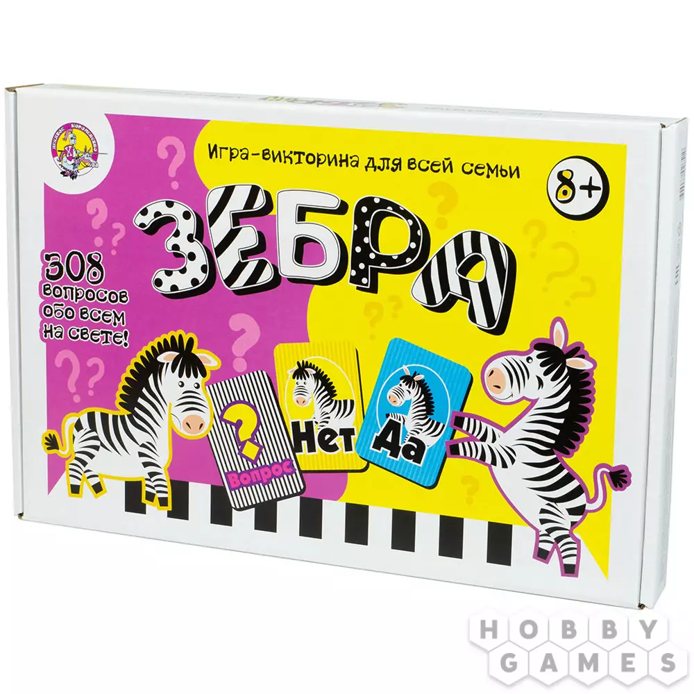 Так много вопросов и всего два ответа – да или нет, – которые будут стоить вам победы. Настольная игра-викторина "Зебра" содержит более трёхсот карточек с вопросами на различные темы, ответы на которые знают не только взрослые, но и дети. Суть проста: ведущий читает вопрос – игроки делают ставку на свой ответ. Все, кто дал верный ответ, двигаются вперёд на количество выигранных очков, а кто нет, те оштрафованы. Соберитесь в кругу семьи, блесните знаниями и доберитесь до финишной черты так же быстро и грациозно, как настоящая зебра!