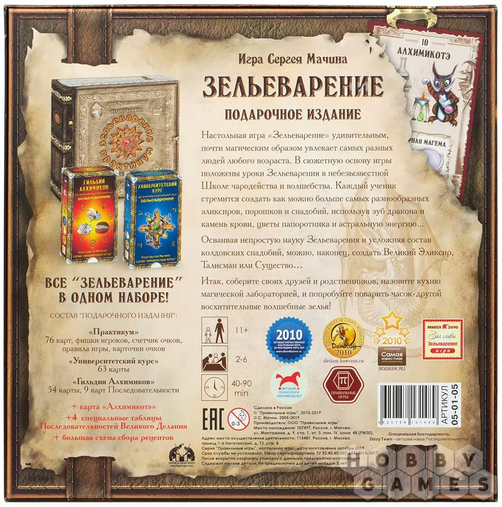 Владимир16.09.2018 19:29Купил своему младшему брату на день рождения данный подарочный набор. Не пожалели — играем всей семьей в течение года. Можно большой компанией играть, а можно один на один — интересно будет в любом случае. Но рекомендую все же, чтобы принимало участие более двух людей. Игра несложная, но некоторые из пунктов правил требуют отдельных оговорок, т.е. не везде и не всегда все так однозначно. Однако, впрочем, особого ума на освоение не нужно. Оформление и картинки глаз радуют, тем не менее, имеет место множество повторений среди изображений эликсиров и зелий. Хотя на это не обращаешь много внимания, когда уже долго играешь в Зельеварение. Присутствует вариативность. Захотелось хардкора с множеством условий победы? Хватай набор и все дополнения. Захотелось сыграть быстренько (относительно)? Бери базовый набор (или его плюс одно любое из дополнений, может быть любимое). Итого, игра стоит того, чтобы купить и играть.