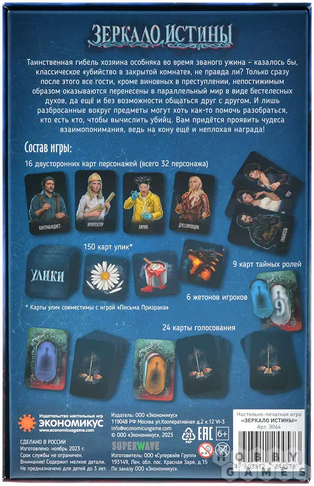 Поведайте всем игрокам душераздирающую историю, которая связывает вас с хозяином дома. Возьмите по карте тайных ролей, которые помогут объяснить, кем вы являетесь. Важно заметить, что все игроки невиновны, а убийц надо вычислить методом исключения. “Зеркало Истины” – соревновательная игра в отличие от других игр этой серии, где две команды борются друг против друга... Здесь каждый игрок должен объяснить личность своего персонажа и при этом стать первым, кто разгадает тайны других и разоблачит убийцу.