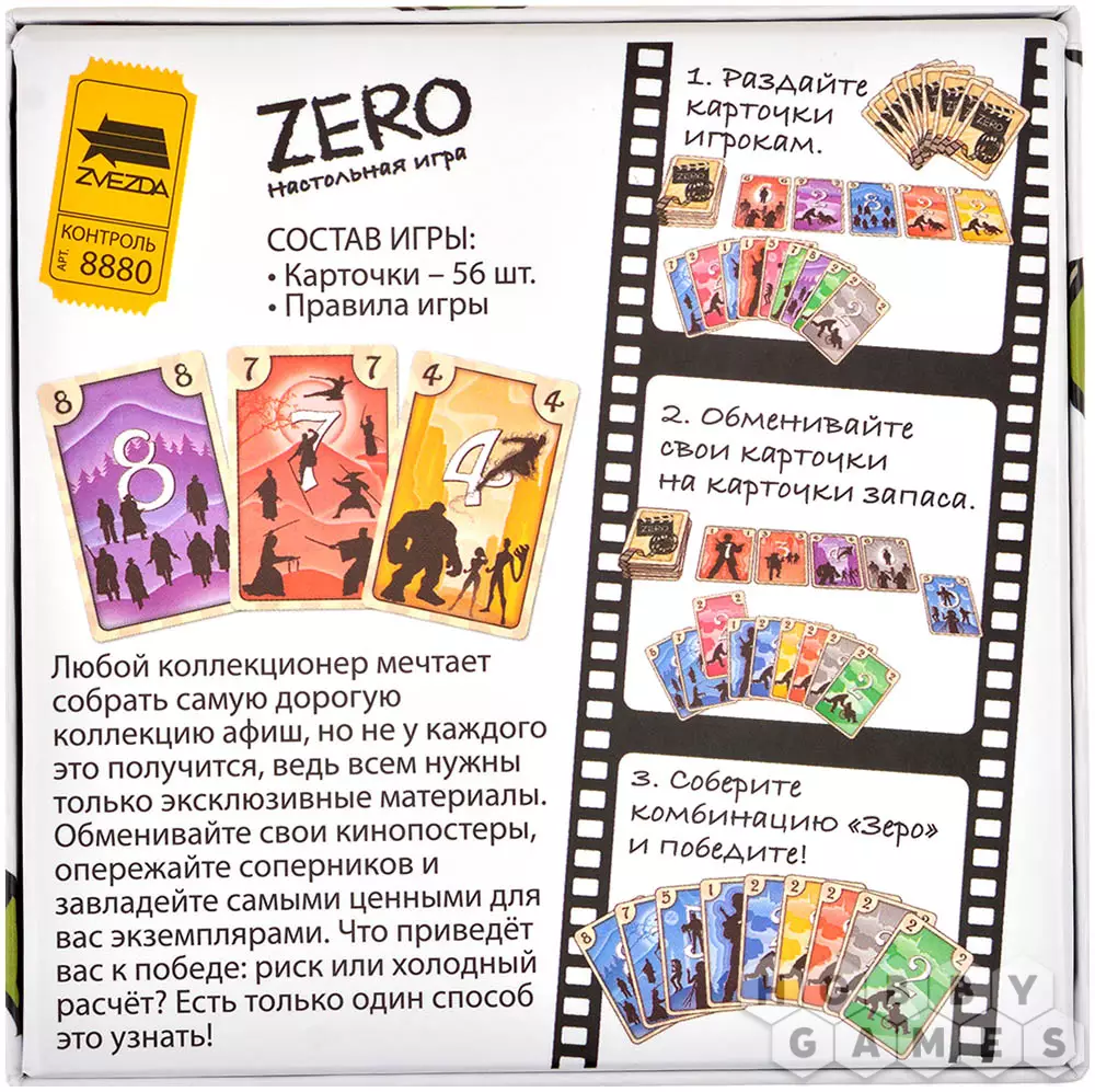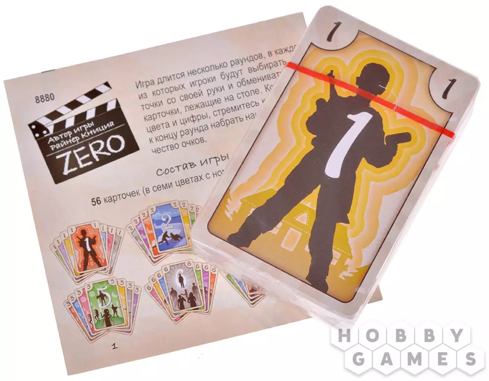ZERO – это динамичная карточная игра, где игроки соревнуются в мастерстве обмена и комбинирования карт. В вашем распоряжении – красочные карточки семи цветов с номиналами от одного до восьми. Цель проста: к концу раунда набрать как можно меньше очков, создавая уникальные комбинации. Игра длится несколько раундов, в каждом из которых участники обменивают карты со своей руки на те, что лежат в общем запасе. Особый шарм ZERO – в его "зеро-комбинации": собрав пять карт одного цвета и пять карт одного номинала (с одной общей картой), вы мгновенно завершаете раунд с нулём очков! Но будьте внимательны – ошибка в комбинации продлит игру, а ваши соперники не дремлют...