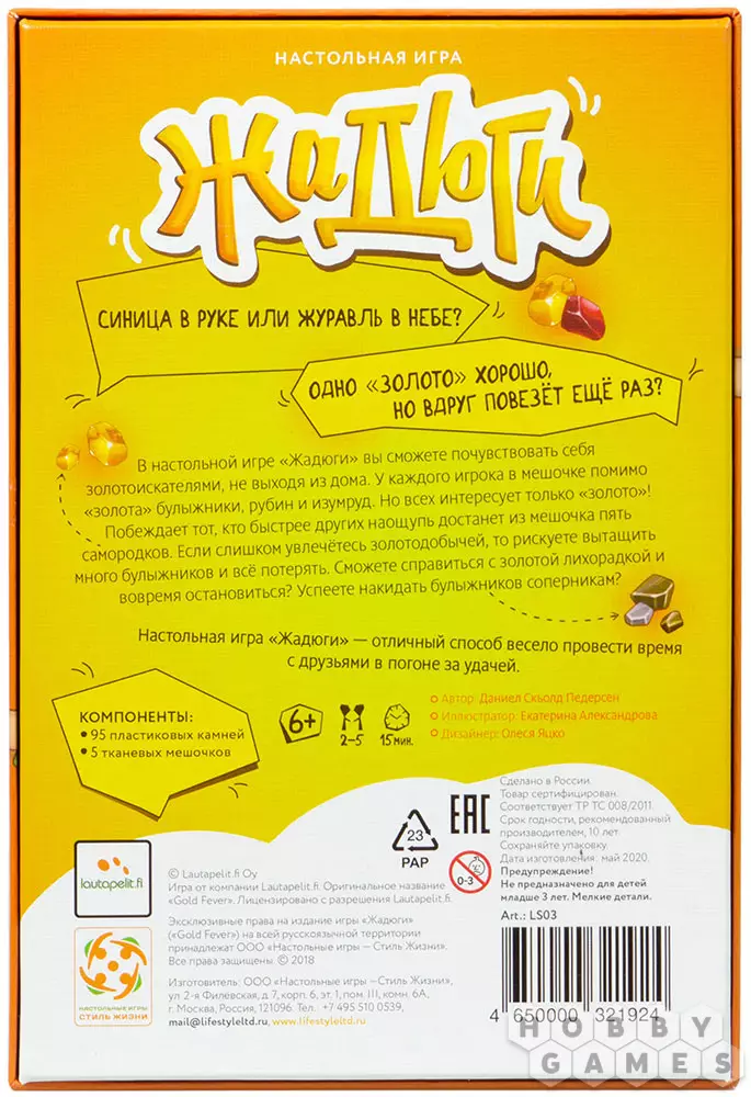 id4139838320.09.2020 15:53Отличная игра для компании, не требующая смысловой нагрузки. Золотая лихорадка превращает ее в сумасшествие!)