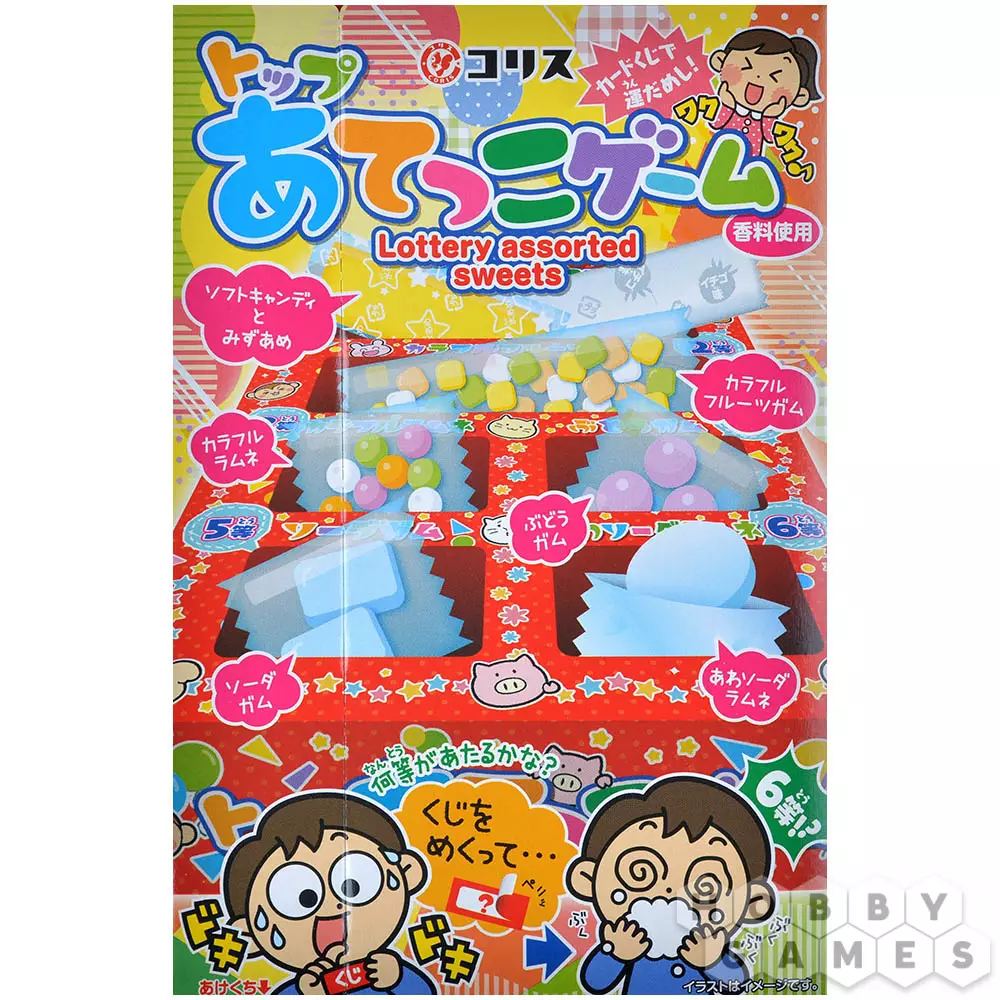 Это небольшой набор из семи разнообразных видов сладостей. С ним вы сможете сыграть со своими друзьями и близкими в мини лотерею. Путём жеребьёвки вы можете определить, какую конфету вы получите в качестве приза, выбирая из шести вариантов. В коробке вы найдёте леденцовую воду, мягкие леденцы, три вида жевательной резинки и два вида рамунэ. Эта игра в угадайку станет отличным развлечением для детей!