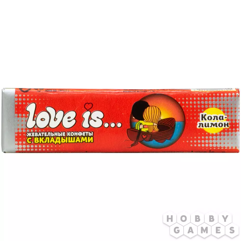 Перед вами упаковка жевательных конфет Love is... со вкусом колы и лимона. Каждая конфета упакована в индивидуальный вкладыш с картинкой на извечную тему любовных отношений.