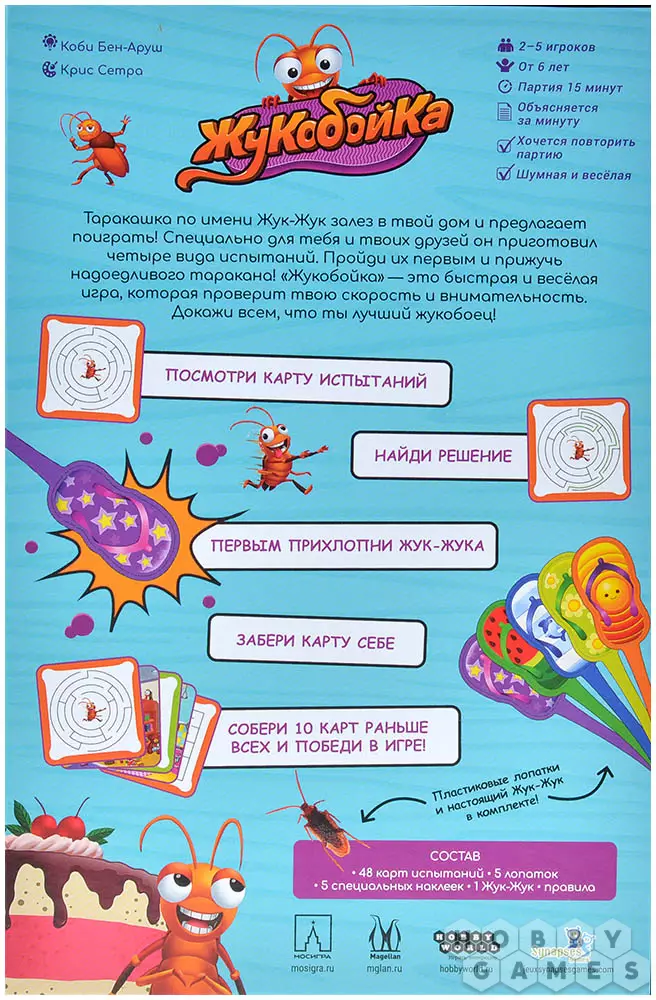 Для начала раздайте каждому игроку по лопатке – она вам понадобится, чтобы бить по пронырливому таракану в ходе игры! Перемешайте и положите колоду, а рядом с ней разместите самого Жук-Жука таким образом, чтобы всем было удобно до него дотянуться. Готовы? Можно начинать игру!