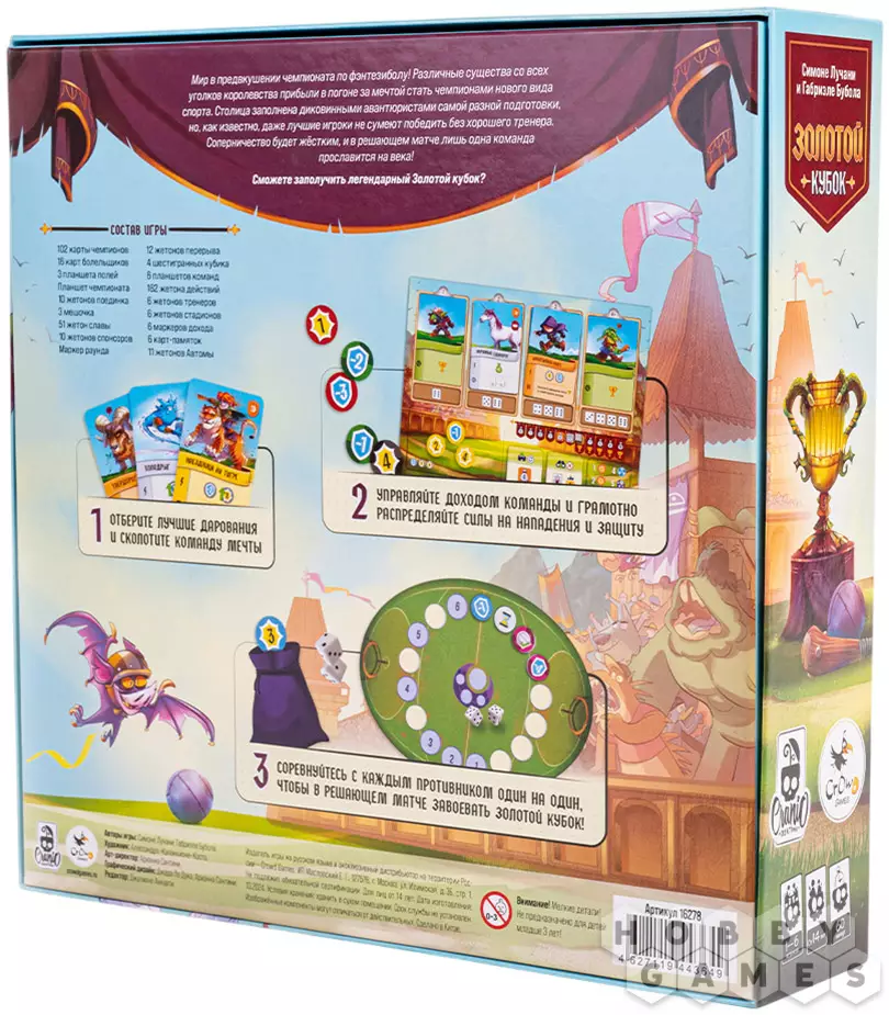 "Золотой кубок" – это динамичная настольная игра, где вы берёте на себя роль тренера фэнтезийной команды. Собирайте уникальных чемпионов, улучшайте их навыки и участвуйте в захватывающих матчах! В вашем распоряжении – карты существ трёх уровней силы, жетоны действий и специальные способности. Шесть раундов турнира, фазы подготовки и зрелищные поединки – здесь нужно продумывать каждый ход и уметь импровизировать. А яркие иллюстрации и качественные компоненты погружают в атмосферу настоящего фэнтези-спорта.