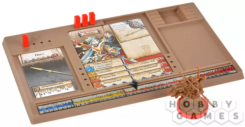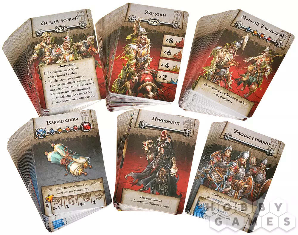 Фаза игроков – вы получаете три действия на персонажа (на старте). Двигайтесь по зонам, преодолевая стены и лестницы, но будьте осторожны – за выход из зоны с зомби придётся заплатить дополнительными действиями. Обыскивайте здания (только там, где нет врагов), чтобы находить новое оружие – от кинжалов до древковых алебард, позволяющих бить врагов издалека. Меняйтесь снаряжением с союзниками, активируйте цели или отдавайте приказы страже – эти бесстрашные бойцы могут атаковать, двигаться и даже опрокидывать котлы с кипящей смолой на орды нежити.