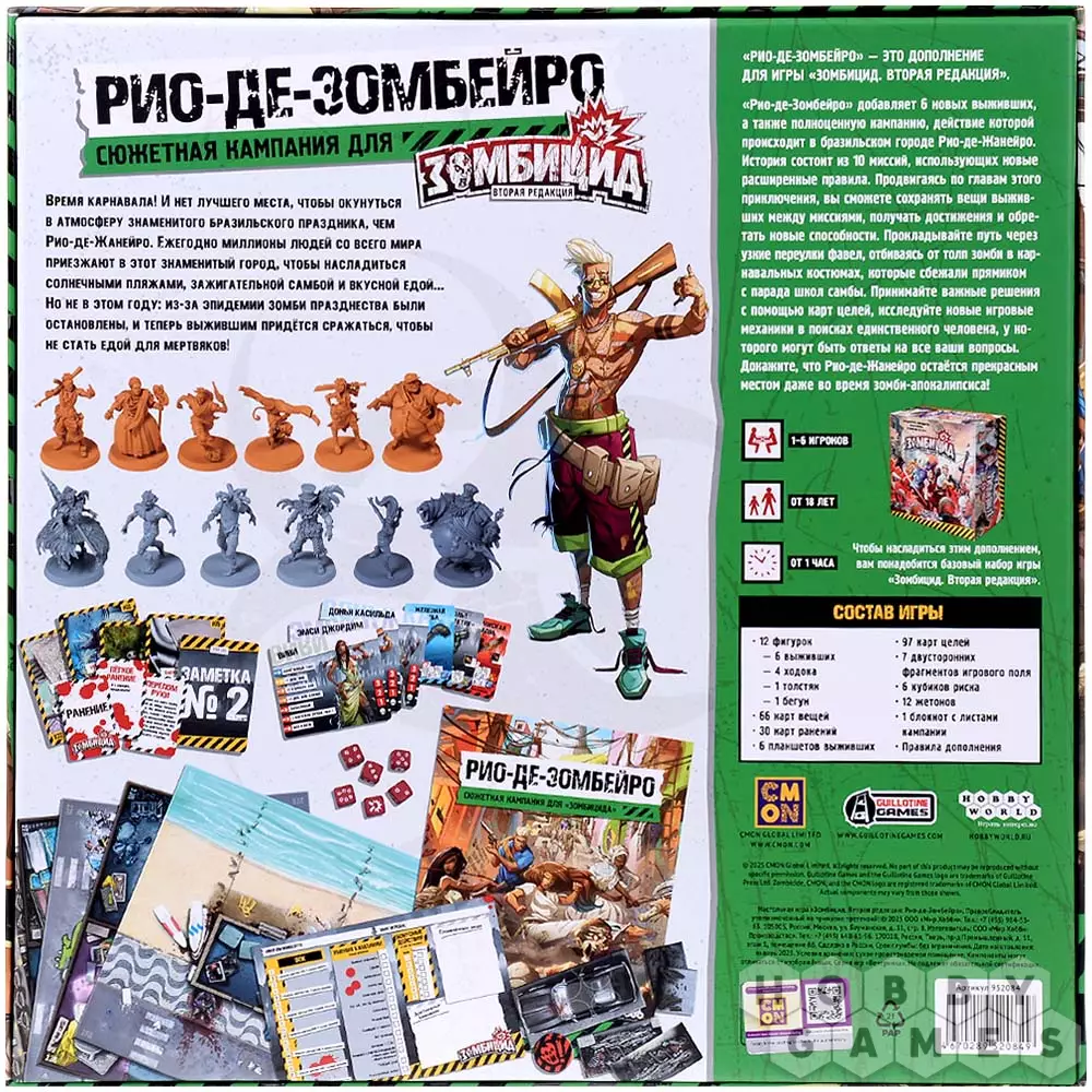 Перед вами новое дополнение для игры "Зомбицид. Вторая редакция", которое порадует ещё большим количеством увлекательного контента! Вы не только сможете пройти полноценную кампанию, состоящую из 10 миссий и привязанную к расширенным правилам, но также получите возможность сыграть одним из 6 новых выживших. Ваше приключение будет проходить в Бразилии, в Рио-де-Жанейро, в самый разгар традиционного карнавала. Отбивайтесь от зомби в праздничных костюмах, лавируйте по узким улочкам, собирайте полезные вещи, получайте новые способности. Не забывайте о своих целях, получайте особые достижения, расправляйтесь со сложностями и врагами – всё ради того, чтобы получить ответы на свои вопросы. Рио-де-Жанейро ждёт вас – и его весьма кровожадные обитатели тоже!
