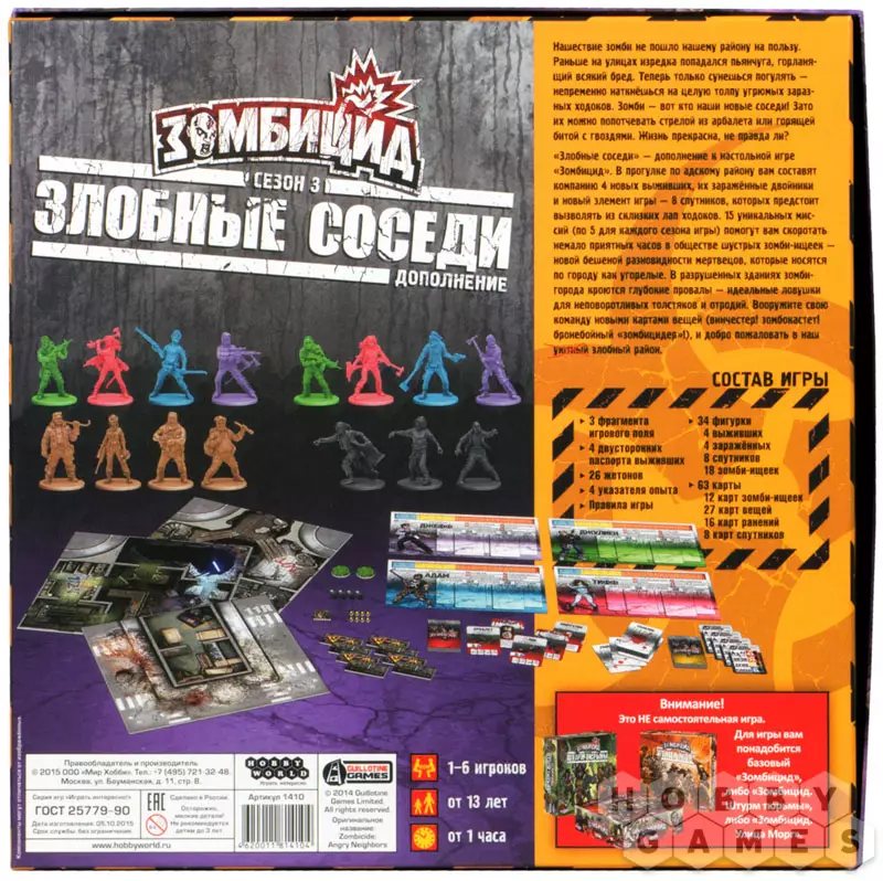 "Зомбицид" – кооперативная приключенческая настольная игра в сеттинге зомби-апокалипсиса для 1-6 игроков. Игра превратит вас в настоящих выживальцев, которым, независимо от их собственных желаний, придётся бросить вызов целым ордам оживших мертвецов. Каждая игровая миссия предложит вам свой сюжет, свои цели и особые правила. После страшной эпидемии разрешено всё – катайтесь по городам, уничтожайте пожирателей мозгов, забирайте припасы и оружие, не забывайте спасать оставшихся в живых, но главное – действуйте сообща!