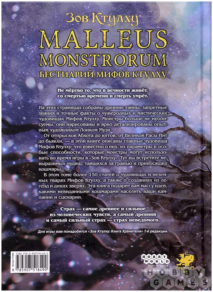 На страницах этого тома вы столкнётесь лицом к лицу с мраком и ужасом. Воображение не всегда может справиться со всеми сценами мира Лавкрафта. Мифы Ктулху, тайны древних монстров, выходящие за пределы понимания смертных, оживают на страницах бестиария. От ужасов Абхота до юггов, от таинственной Расы Йит до бьякхи, книга оживляет всех существ, которые только в самых страшных кошмарах могут присниться.