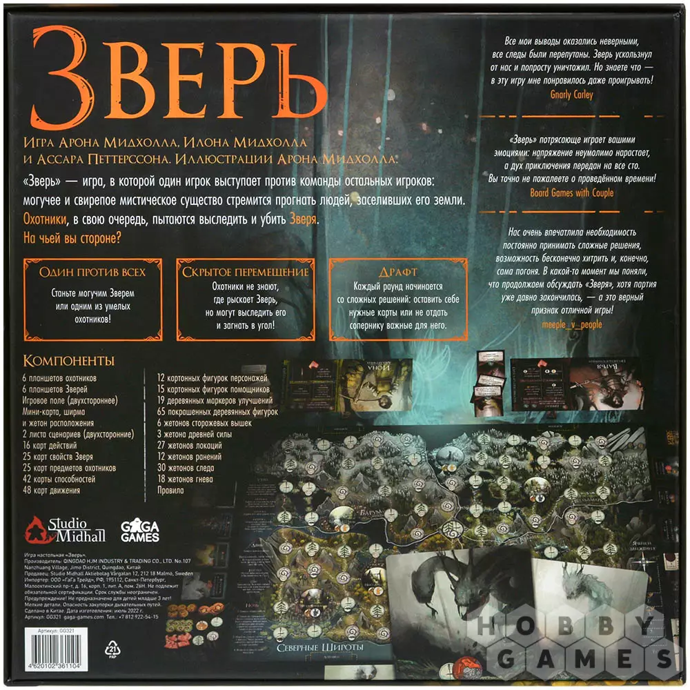 "Зверь" – это полукооперативная настольная игра, в которой часть игроков возьмёт на себя роль охотников и будет сражаться против одного игрока, управляющего Зверем. Задача Зверя – расправиться с определённым количеством поселенцев, в то время как охотники будут стараться ему помешать.