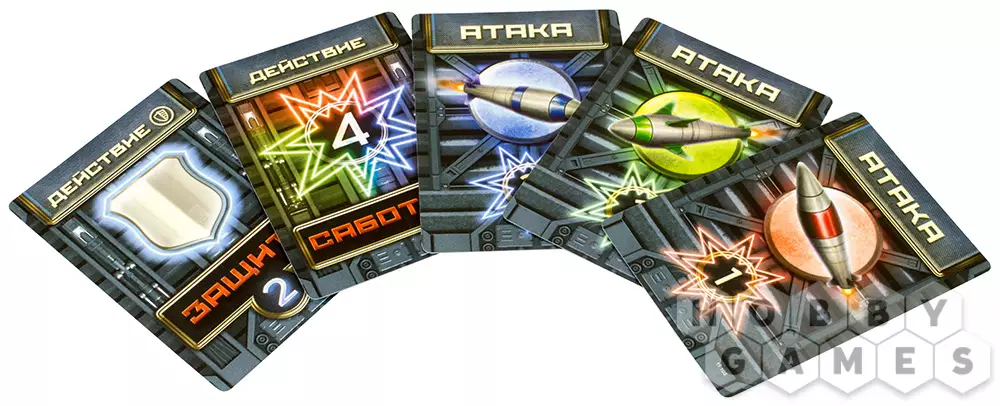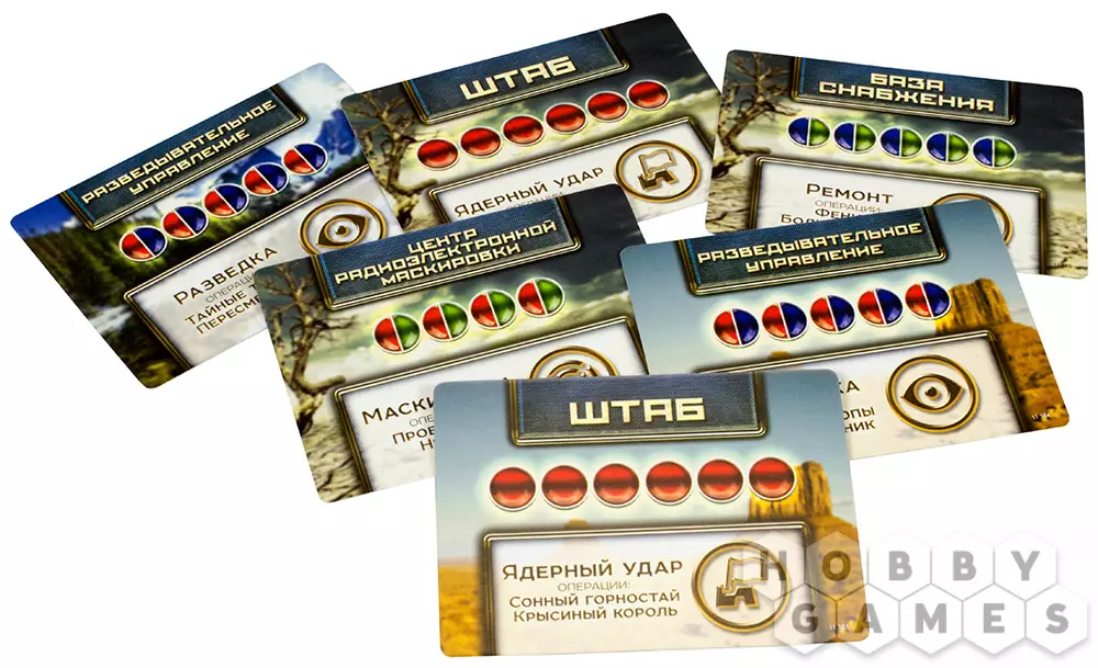 "Мирного решения" конфликта не предвидится, а для "силового" игрокам предлагается специальная боевая колода. В ней вы найдёте все маневры, которые могут спасти ваши объекты от уничтожения, а вражеские — превратить в радиоактивный пепел. Маскировка позволит снова спрятать ваш штаб, если он оказался обнаружен с помощью разведки. Ремонт позволит восстановить объекты после успешно проведённой атаки противника.