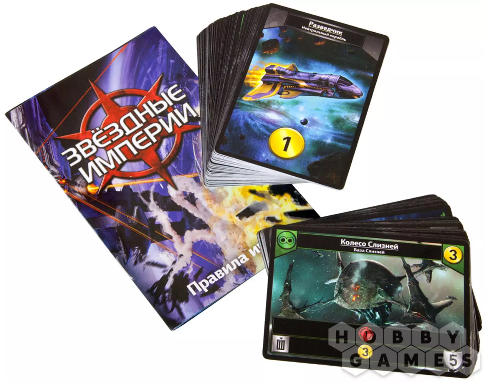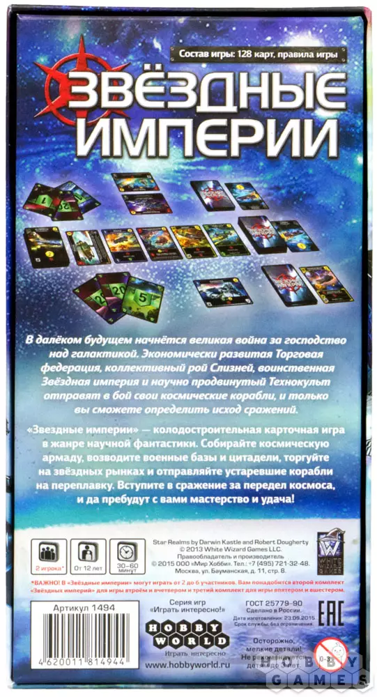 "Звёздные империи" – колодостроительная игра для 2-6 человек на космическую тематику. Игрокам предстоит собрать свой флот, оборудовать базы и аванпосты и атаковать друг друга для снижения очков влияния противника. Все игроки начинают в равных условиях. Используя различные комбинации карт с уникальными свойствами, игроки сами выбирают свою стратегию во время самой партии, вырабатывают защиту от атак противника и ищут бреши в обороне противника. Можно идти разными путями, пользоваться силой, хитростью или богатством, но всем одинаково понадобятся мастерство, интуиция и хладнокровный расчёт!