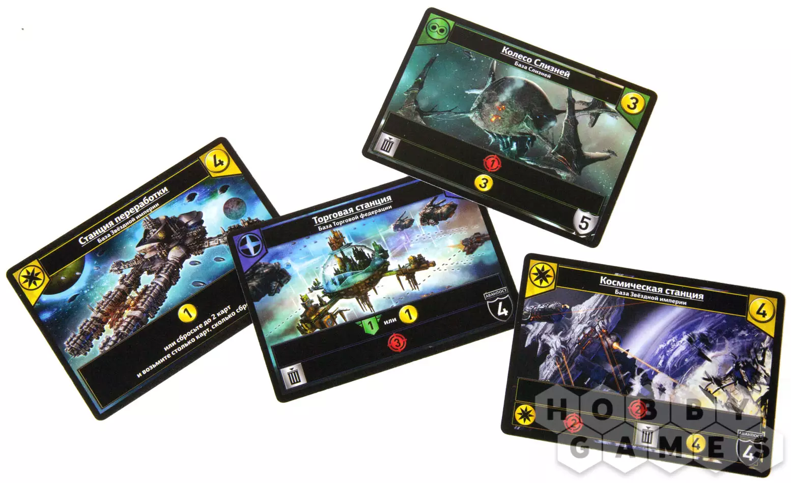 Карты обладают различными свойствами, которые применяются в различные фазы хода и дают вам уникальные бонусы или способности, на которых и будет построена ваша стратегия победы. С помощью карт приобретают очки боя, торговли или влияния — это ваши основные ресурсы на игру.