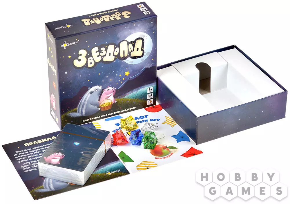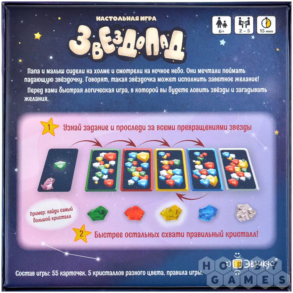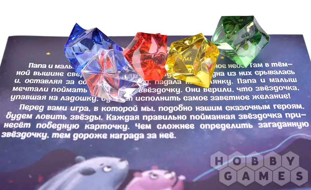 В настольной игре "Звездопад" вы будете находить и ловить осколки звёзд, представленные в виде разноцветных кристаллов. Но только правильный осколок приведёт вас к победе, а он так и норовит ускользнуть из ваших ладоней, постоянно меняя цвет.