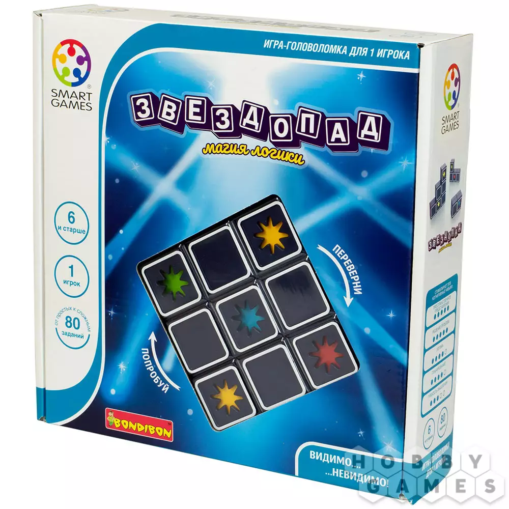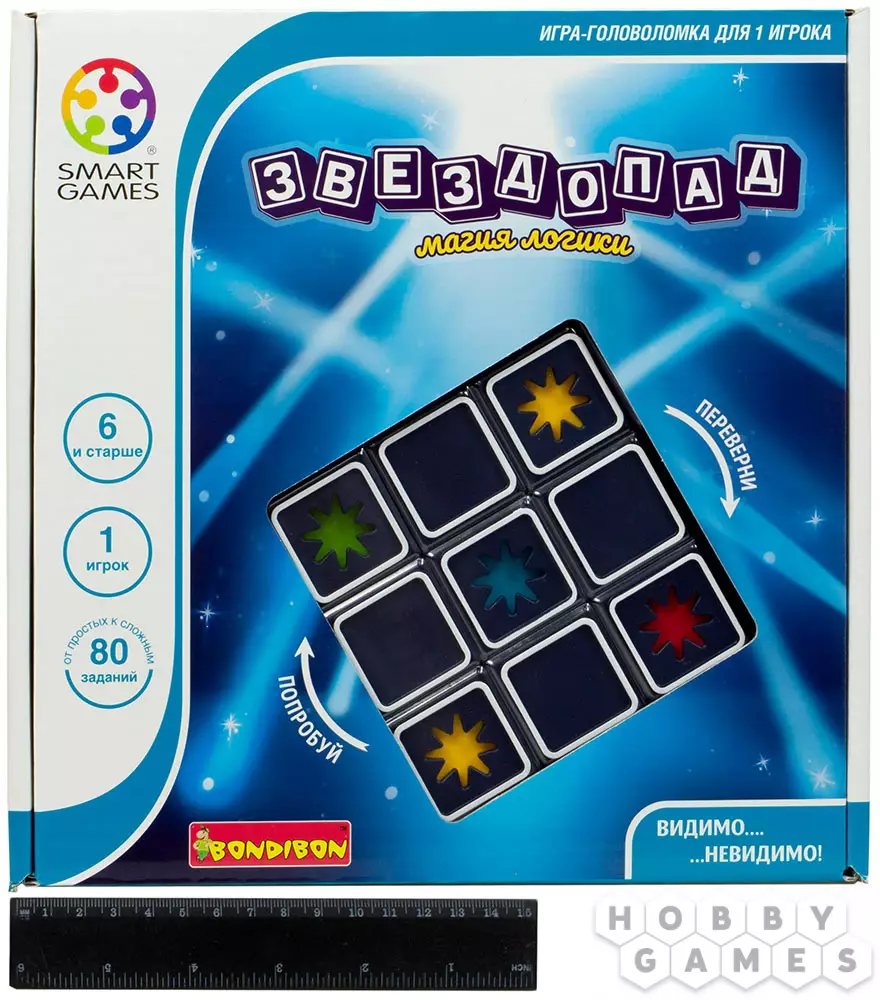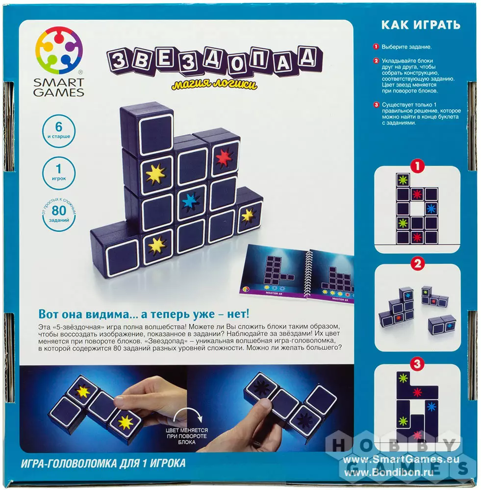 Настольная игра-головоломка "Звездопад. Магия логики" предназначена для одного игрока от шести лет и старше. Каждое из заданий предлагает вам настоящий вызов вашим мыслительным способностям. Всего в игре 80 заданий, разделённых на четыре уровня сложности: начальный, юниор, эксперт и мастер.