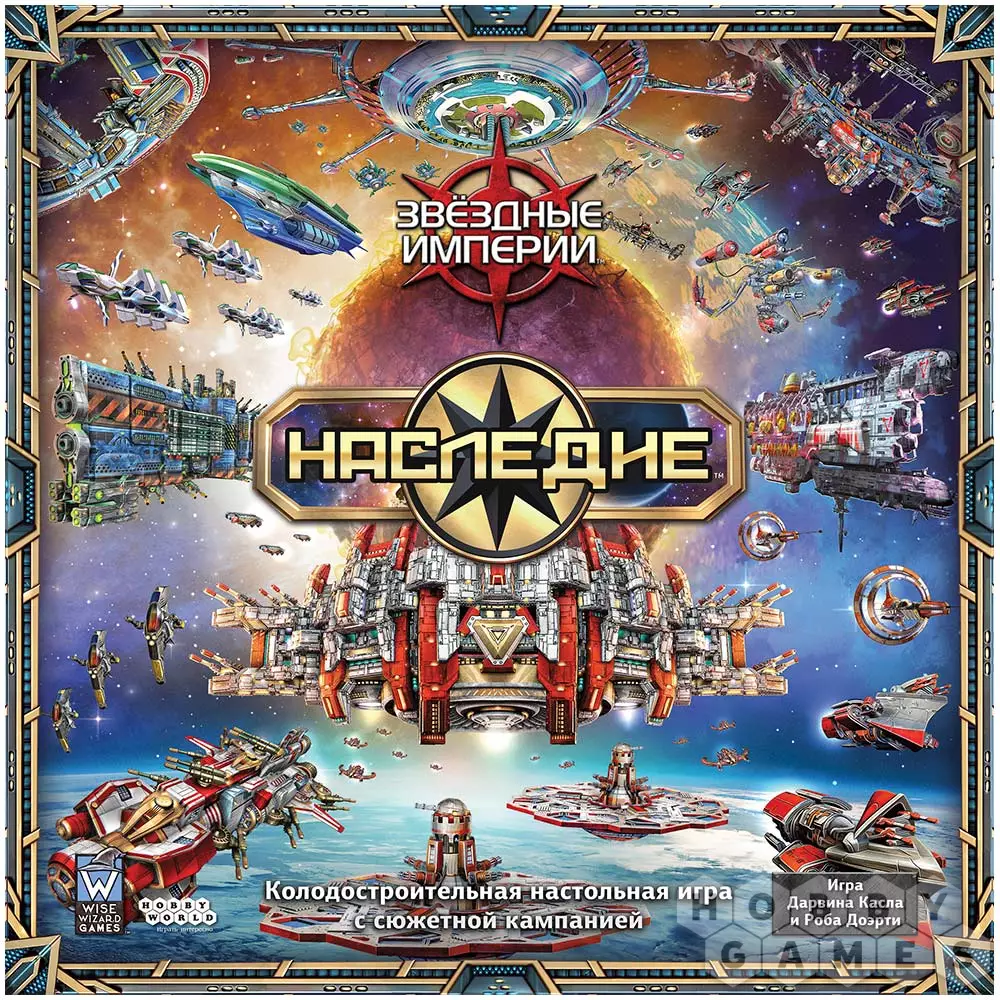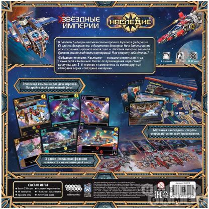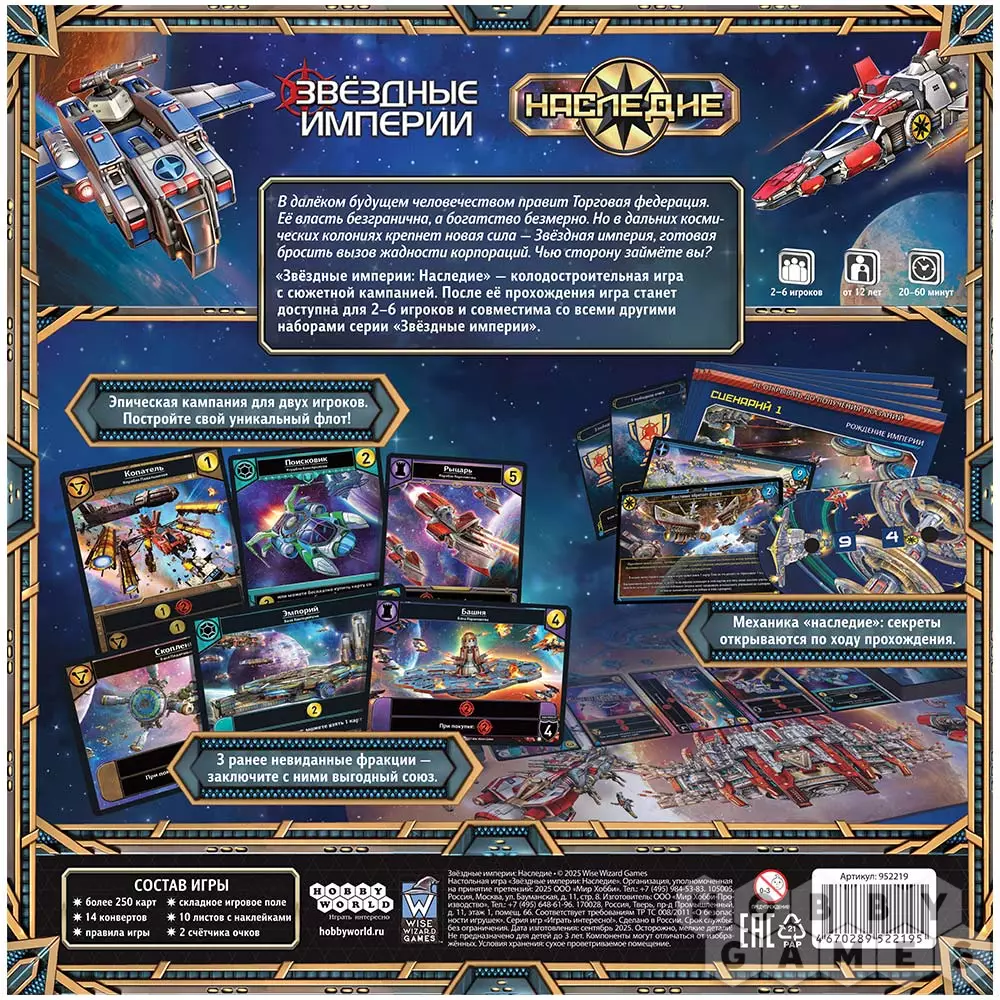 "Звёздные империи: Наследие" – это колодостроительная космическая стратегия с полноценной сюжетной кампанией, где каждый сценарий открывает новые карты, фракции и правила. Игра создана на основе серии "Звёздные империи", поэтому поклонники быстрее вольются в процесс, а новички смогут легко освоиться. По мере прохождения вы будете улучшать корабли и базы, влиять на торговую колоду, получать новые сценарные цели и усиливать влияние своей стороны. После завершения кампании набор превратится в полноценную игру для 2-6 человек, а ещё его можно будет сочетать с другими коробками серии!