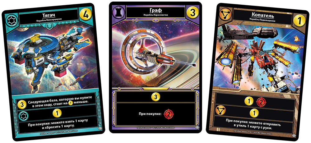 Ход игрока состоит из трёх фаз. В основной фазе вы разыгрываете карты с руки, используя их первичные эффекты и свойства. Очки торговли позволяют покупать корабли и базы из торгового ряда, а очки боя – наносить урон противнику или уничтожать его базы. Если у противника есть хотя бы один разыгранный аванпост, сначала предстоит уничтожить его, чтобы уже затем атаковать самого соперника или его объекты.
