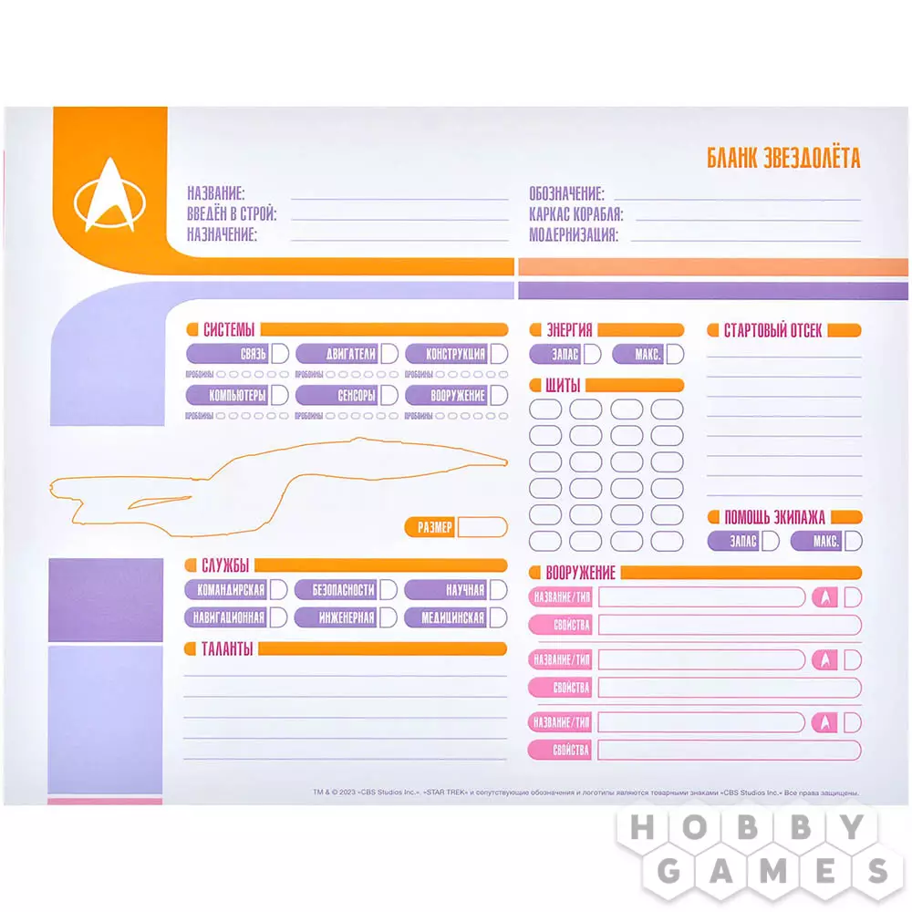 Чтобы вступить в ряды Звёздного Флота, вы должны кем-то быть. А для того, чтобы записать свои данные, вам потребуется бланк. В этом наборе вы найдёте их в количестве 5 штук, и они многоразовые! А значит, что у вас есть возможность дать жизнь любому количеству своих задумок. Создайте уникальный экипаж звёздного корабля. Кстати, о корабле: в комплекте вы также найдёте и его бланк, чтобы отслеживать всю информацию о нём.