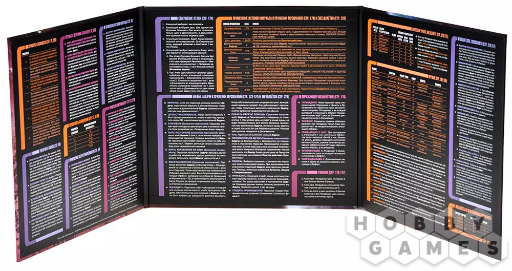 Эта ширма ведущего для настольной ролевой игры "Звёздный путь: Приключения в космосе" содержит на себе множество полезной информации об основных игровых механиках. Она состоит из трёх секций, а выполнена из плетёного картона высокого качества. Ведущему она поможет не только помнить основные правила, но и скрывать броски кубиков от игроков. Также в комплекте с ширмой идёт карта-плакат Альфа- и Бета-квадрантов, покрытый матовой ламинацией, а ещё полезные раздаточные материалы.