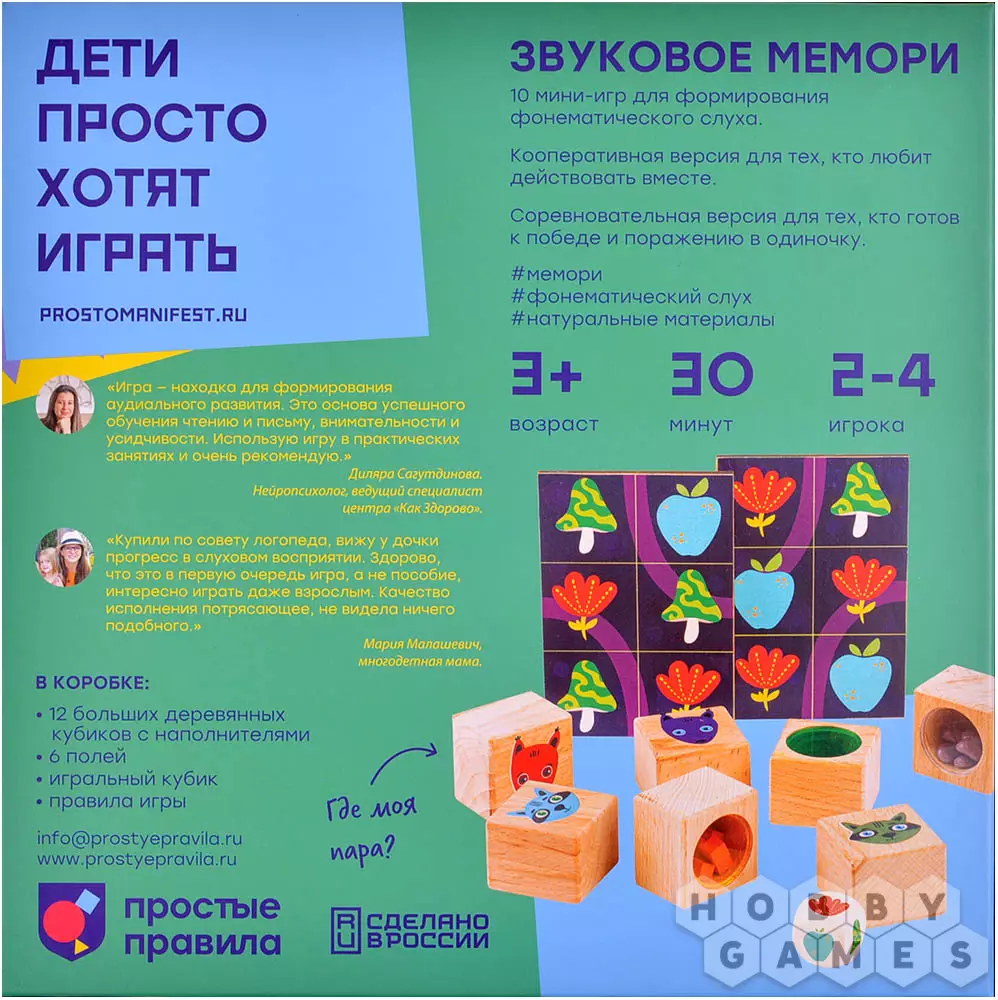 В коробке с этой игрой вы найдёте курс развития звукового восприятия, которое очень важно в процессе любого обучения маленьких детей. Он состоит из десяти мини-игр для игры ребёнка со взрослым, каждая игра отличается от другой уровнем сложности. Кубики выполнены из дерева и приятны на ощупь, а яркие иллюстрации животных на них привлекут к себе внимание юных игроков.